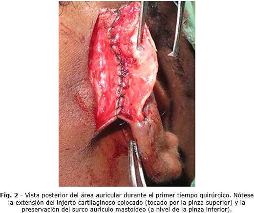 Se decide esperar tres semanas, con el fin de lograr cicatrización local, e indicar chequeo preoperatorio, que se encontró entre parámetros normales. Al cabo de este tiempo se efectúa el primer momento reconstructivo quirúrgico, bajo anestesia local, mediante la realización de una modificación de la técnica de Mladick, con la colocación de un injerto autólogo de cartílago auricular de la oreja contralateral, tomado a medida del defecto presente, que fue fijado mediante puntos de sutura a la estructura cartilaginosa remanente; y, mediante una incisión lineal y disección supraperióstica, introducido en forma de "bolsillo" en la región temporal (Fig. 2). Se suturó del borde anterior de la incisión temporal al extremo del defecto auricular en su cara posterior, y el posterior a la cara anterior de dicho defecto. En el transoperatorio y posoperatorio no se detectaron complicaciones. El paciente fue medicado con analgésicos y antimicrobianos durante la primera semana posterior al acto quirúrgico.