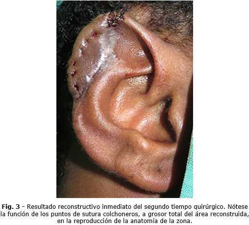 A las tres semanas del primer tiempo quirúrgico, se realiza, bajo anestesia local, el segundo momento reconstructivo con la liberación de la región auricular del "bolsillo" creado, tomando la cubierta cutánea de esta área temporal unida al cartílago previamente injertado, más avance de un colgajo posterior, para cubrir el defecto cutáneo provocado por el paso anterior de este tiempo quirúrgico; y la colocación de un injerto libre de piel, tomado de la cara interna del brazo derecho, en la arista temporal del área reconstruida auricular (Fig. 3).