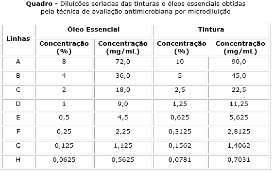 As tinturas foram adquiridas sob a concentração de 20 % correspondendo aproximadamente a 180 mg/mL. Já os óleos essenciais (OE) foram inicialmente diluídos em água destilada estéril e Tween 80, obtendo-se a concentração 16 %. Para obtenção das diluições dos OEs, foi considerada a densidade das substâncias igual a 0,9 g/mL, conforme especificações do fornecedor. Utilizou-se o método de diluição descrito por Aligiannis et al.(6 ) e Lima et al.,(7) no qual foram adicionados em tubos de vidro estéril: 0,8 mL do óleo essencial; 0,05 mL de Tween 80 (emulsificante); e 4,2 mL de água destilada estéril. O conjunto foi agitado durante 5 minutos em aparelho agitador de soluções tipo Vortex (Mod. AP56, Phoenix), sendo a concentração final obtida de 16 %, equivalente a 144 mg/mL. Para avaliação da concentração inibitória mínima (CIM), os óleos essenciais e tinturas foram diluídos de forma seriada, mediante emprego da técnica da microdiluição em caldo infuso de cérebro e coração (ICC).