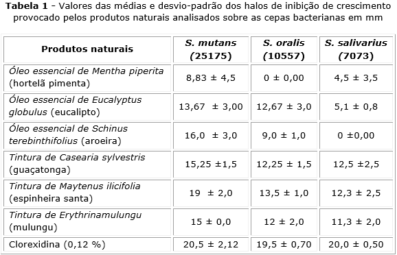 Os halos de inibição em milímetros para os produtos naturais testados frente às cepas bacterianas são descritos na tabela 1. A tintura Maytenus ilicifolia apresentou resultados discretamente superiores aos demais produtos. Dentre os óleos essenciais, Eucalyptus globulus foi o único OE que apresentou atividade antibacteriana significante para todos os microrganismos estudados, apresentando maior halo de inibição para S. mutans (13,67 ± 3,00).