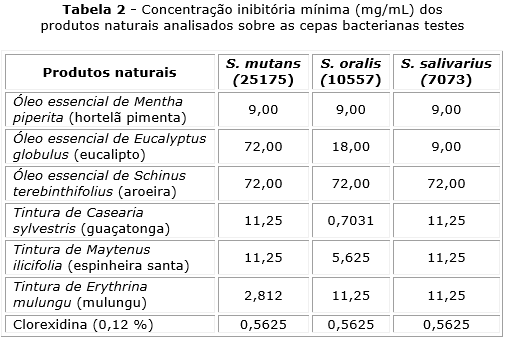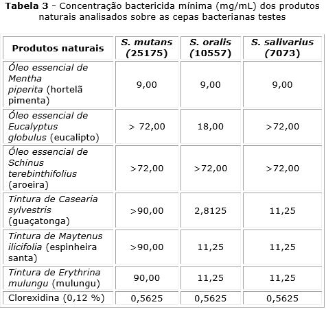 A CIM variou de 72 mg/mL a 0,562 mg/mL, e CBM, 18 mg/mL a 2,8125 mg/mL. Apenas Mentha piperita e Erythrina mulungu apresentaram ação frente a todos os microrganismos orais no teste de CBM, e os únicos a mostrarem atividade bactericida frente a S. mutans (tabela 3). A Clorexidina (0,12 %) obteve ação sobre as todas as cepas nas menores concentrações avaliadas para o produto.