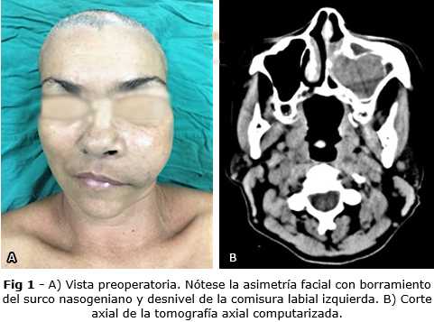 Al examen físico regional presentó aumento de volumen en región infraorbitaria izquierda, no doloroso a la palpación, de consistencia firme y fijo a planos profundos. Además se constató borramiento del surco nasogeniano izquierdo, desproporción de las fosas nasales y descenso de la comisura labial izquierda en el eje horizontal (Fig. 1, A). Al examen intrabucal se observó desdentamiento parcial superior e inferior no rehabilitado protésicamente, aumento de volumen en región de paladar duro, de consistencia duroelástica, de aproximadamente 5 cm de diámetro, con expansión de las corticales óseas del maxilar y desviación de la línea media superior hacia el lado derecho.