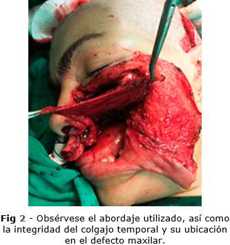 Se decidió realizar tratamiento quirúrgico bajo anestesia general nasotraqueal. Se utilizó el abordaje de Ferguson Weber y se resecó la lesión con margen oncológico de seguridad, incluyendo hueso maxilar y una porción de los huesos cigomático y palatino. El defecto maxilar fue reconstruido con el colgajo pediculado de músculo temporal (Fig. 2), al que se accedió mediante un abordaje coronal.