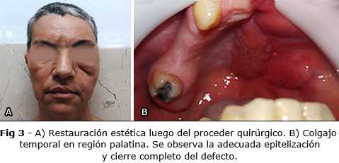 Se garantizó la integridad del colgajo temporal en el posoperatorio con la indicación de alimentación enteral por sonda nasogástrica. Se mantuvo el seguimiento por consulta externa, constatando buena evolución clínica, así como integridad del colgajo temporal utilizado para reconstruir el defecto palatino (Fig. 3). Se logró la epitelización secundaria del músculo temporal en el área palatina, cubriendo completamente el defecto de la zona y asegurando las funciones estéticas y funcionales como la deglución y fonación. Se indicó quimioterapia y radioterapia como adyuvantes al tratamiento quirúrgico.