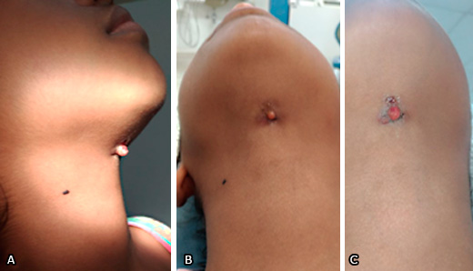 Fig. 1 - Condição extra-oral da paciente, evidenciando ponto de drenagem extra-oral cutâneo; vista lateral (A) e inferior (B-C).