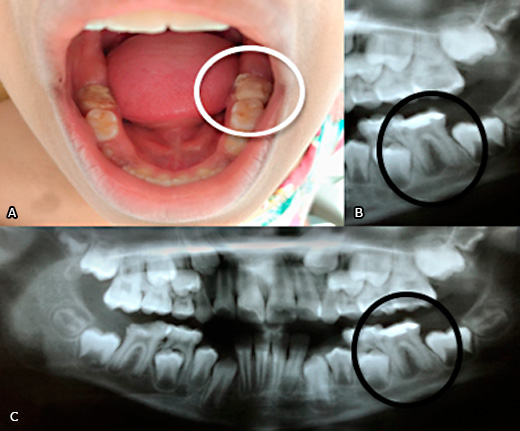 Fig. 2 – A: Condição intraoral da paciente, evidenciando restauração extensa dos molares inferiores 36 e 46. B e C: Radiografia panorâmica da paciente, indicando lesão associada a unidade 36.