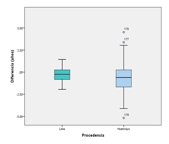 La comparación de las diferencias entre la edad cronológica con la edad dental según el método Demirjian utilizando radiografías panorámicas entre las dos localidades peruanas de diferente altura sobre el nivel del mar se encontró que no existe diferencia estadísticamente significativa (U de Mann-Whitney, p= 0,057) (Fig. 2)