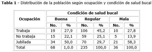 En el grupo evaluado con la condición de salud bucal buena, la población jubilada representó el 50,0 % (tabla 1). Correspondió también a jubilados el 58,3 % de los que presentaron mala condición de salud bucal, y en la condición de regular se destacó la población trabajadora con 45,2 %.