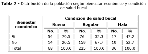En la condición de salud bucal evaluada como buena, el 79,5 % de los adultos mayores refierió estar satisfecho con su situación económica; en las condiciones de salud evaluadas como regular y mala, refirieron no tener un adecuado bienestar económico el 67,7 % y 52,7 % de los ancianos, respectivamente (tabla 2).