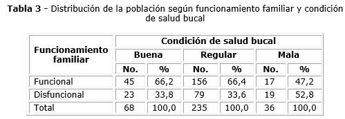 De los adultos mayores que vivían en familias funcionales, el 66,4 % y el 66,2 % presentaron condiciones de salud bucal evaluadas de regular y buena, respectivamente. El 52,8 % de los clasificados con mala condición de salud bucal, coexistieron en familias disfuncionales (tabla 3).