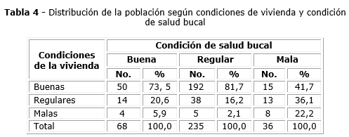 El 73,5 % de los que presentaron una condición de salud bucal buena poseían buenas condiciones en su vivienda. Por otra parte, el 81,7 % de los que fueron evaluados como regular en cuanto a la condición de salud bucal, vivían en viviendas con condiciones regulares, los que poseían una mala condición de salud bucal el 41,7 %, vivían en buenas condiciones (tabla 4).