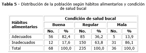 Los adultos mayores que presentaron buena condición de salud bucal representaron el 82,4% de los que poseiann hábitos alimentarios adecuados. Entre los ancianos con la condición de salud bucal regular, destacaron aquellos con hábitos alimentarios inadecuados para 63,8 %, seguida de los evaluados con mala condición de salud bucal, con 86,1 % (tabla 5).