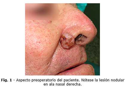 Al examen físico regional se detecta asimetría facial por alteración del contorno del ala nasal derecha por lesión de base sésil, de aspecto úlcero-costroso, de aproximadamente un centímetro de diámetro, forma redondeada, color rosáceo, con bordes irregulares, consistencia duro elástica y no dolorosa a la palpación, que hace llegar a una impresión diagnóstica de carcinoma basocelular (Fig. 1). Se establece diagnóstico diferencial con el carcinoma epidermoide, que solo puede corroborarse mediante estudio histopatológico.