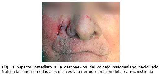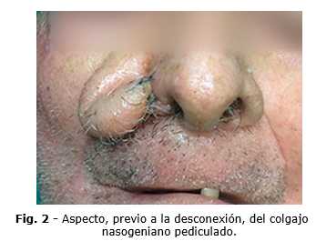 Hubo seguimiento evolutivo con curación de forma ambulatoria durante 4 semanas, momento en que se realiza un segundo acto quirúrgico bajo anestesia local, en el cual se efectúa la desconexión del colgajo pediculado (Fig. 3). En la evolución postoperatoria el paciente no mostró complicaciones y refirió una alta satisfacción con los resultados estéticos y funcionales obtenidos.