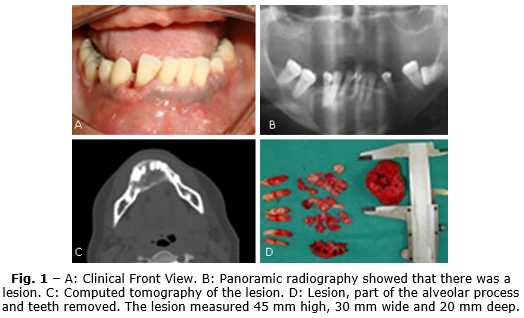 After performing the computed tomography exam (Fig. 1, C), an intraoral access was performed for extracting the mandibular teeth in direct contact with the lesion. A submental extraoral incision was performed for enucleation of the pathology, preserving the mandibular base and lingual cortical. After removal of the lesion (Fig. 1, D), the local reconstruction was performed with 10 mL of tibial bone graft, that was inserted into the surgical cavity. A titanium screen was used as a support for the soft tissue and bone graft. These procedures were performed in the hospital.