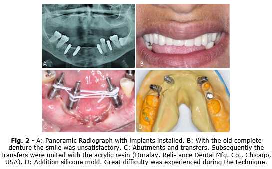 A plastic tray was tried-in, cut and the transfers of the open tray were adapted on the abutments (Fig. 2, C). Using addition silicone (Elite, Zhermack, S.p.A., Italy) the impression was made, following the manufacturer's recommendations (Fig. 2, D).