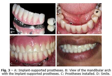 The rehabilitation with RPD probably would not have a good prognosis in this situation, due to the tissue losses, the location, the inclination and amount of teeth remaining of the patient. According to Campbell et al., the evaluation of the dentition state, tooth position, adapting structures within the RPD, timely recall, and maintenance are necessary for successful treatment.(17) In addition, the treatment with RPD can cause overload on natural teeth, periodontal damage and increased incidence of caries.(18)