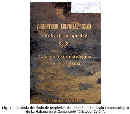 Abstract: Funerary monuments containing several tombs are called burial vaults. The purpose of the study was to describe some historical elements of the burial vault of the Dental College of Havana in Colon Cemetery. A historical-particular-descriptive study was conducted from June to December 2017. A review was performed of documents related to the topic in Colon Cemetery. The information obtained was arranged chronologically to facilitate the description of events related to the burial vault, and a search was carried out on the Internet and libraries to clarify the definitions and find similar research studies. All the information was scanned in a library created on EndNote X7 to facilitate the processing of the text in Microsoft Word. The burial vault was sold to the Dental College of Havana on 21 April 1939 as a parcel of land in Colon Cemetery. It is located in the South-West Quarter, Lot No. 6 of the Third Class Monuments Area, and carries the number 22361. Burials in the vault started on 14 January 1940, and the marble used for its construction was supplied by "Mármoles Pennino".