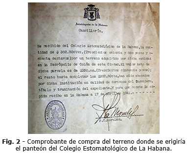 El 21 de abril de 1939 el Arzobispo de La Habana Excelentísimo Monseñor José Manuel Dámaso Ruíz y Rodríguez, le vende al Colegio Odontológico de La Habana una parcela de tierra en la Necrópolis Cristóbal Colón. La venta se efectuó a un precio de $350.00 de los cuales dicha organización culminó el pago el 17 de abril de 1941 abonando un total de $382.80 de su valor en el cual estaban referidos los intereses por los pagos a plazo (Fig. 2).