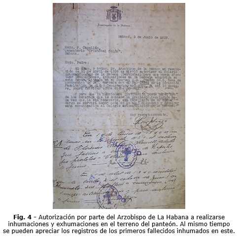 Documentos originales fueron revisados y analizados en la Necrópolis de Colón (Fig. 1) Estos datan desde la compra del terreno en la Necrópolis Cristóbal Colón hasta las autorizaciones de inhumaciones y exhumaciones de cadáveres en el panteón construido posteriormente y hasta la fecha. Se realizó una revisión de documentos en el Arzobispado de La Habana. La información se organizó cronológicamente para poder relatar acontecimientos referentes al panteón y se hizo una búsqueda bibliográfica en Internet y en bibliotecas para el esclarecimiento de definiciones, nombres de personas involucradas en la investigación, así como también el hallazgo de investigaciones similares.