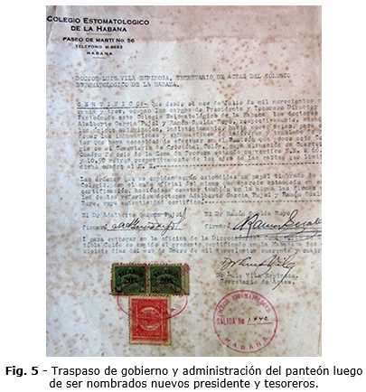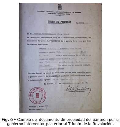 El 17 de octubre de 1961, años más tarde al Triunfo de la Revolución, se emite por el Gobierno Municipal Revolucionario de La Habana un nuevo título de propiedad del terreno del panteón del Colegio Estomatológico de La Habana. Esto se debió a que todos los propietarios de terrenos en dicha necrópolis tuvieron que acreditar sus propiedades para ser renovadas por la nueva administración. El Interventor-Administrador en ese momento se llamaba Pablo Cardallez (Fig. 6).