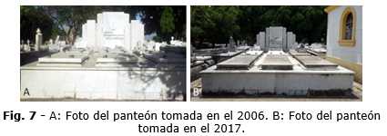 En los últimos cinco años el panteón ha sufrido deterioro y ha sido víctima de vandalismos. Las cubiertas de mármol de las bóvedas 3, 4, 5 y 6 han sido sustituidas por tapas de granito corriente. Algunos lugares de la estructura están fracturados, mohosos y existen jardineras de ofrendas florales de personas que tal vez ya no se encuentren ni en los osarios del panteón. (Fig. 7, A y B).