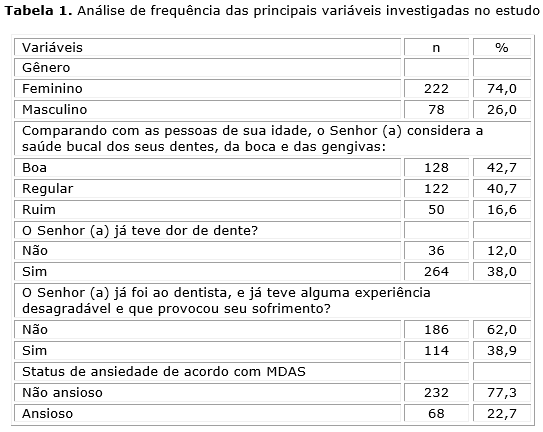 Dos 300 pacientes selecionados para o estudo, 222 (74,0 %) correspondiam ao sexo feminino e 78 (26,0 %) ao sexo masculino, com idade média de 32,7 anos. Em relação à saúde bucal, a maioria dos participantes da pesquisa (42,7 %) relataram apresentar uma boa saúde bucal, enquanto 88,0 % relataram já ter apresentado dor de dente. Ainda, a partir da análise da MDAS foi observado que 22,7 % dos indivíduos foram considerados ansiosos. A tabela 1 exibe os resultados das análises descritivas realizadas nas variáveis categóricas do presente estudo.