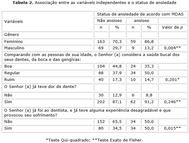 Através da análise bivariada verificou-se associação estatisticamente significativa entre os status de ansiedade e os indivíduos do sexo feminino (p= 0,004). Ainda, observou-se associação estatisticamente significativa entre os indivíduos ansiosos e o histórico de experiências desagradáveis no dentista (p= 0,015). As demais variáveis não se associaram significativamente com o status de ansiedade (tabela 2).