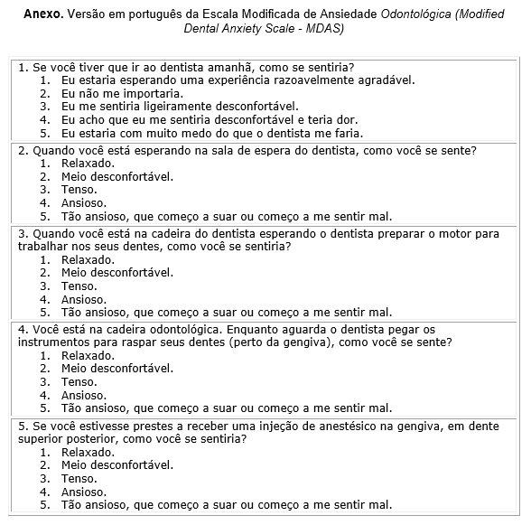 17. Hu LW, Gorenstein C, Fuentes D. Portuguese version of Corah's Dental Anxiety Scale: transcultural adaptation and reliability analysis. Depress Anxiety. 2007;24(7):467-71.