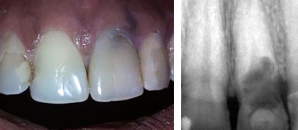 Paciente femenina con antecedentes de salud, de 31 años de edad y muy preocupada por su aspecto estético, quien acude a consulta por discromia en incisivo central superior izquierdo que impresiona necrosis pulpar. Al realizar acceso cameral se detecta sangramiento profuso del tejido existente en la cámara pulpar y al realizar radiografía periapical constata una reabsorción dentinaria interna que llegaba a la superficie externa de la raíz con destrucción de los tejidos periodontales adyacentes (Fig. 1).