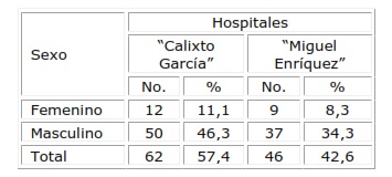 El sexo masculino predominó en el estudio en ambos hospitales, con el 46,3 % en el Hospital Universitario “General Calixto García” y el 34,3 % en el Hospital “Miguel Enríquez”, de los 108 pacientes estudiados (62 y 46 pacientes respectivamente en cada una de estas instituciones). La proporción hombre: mujer fue de 4,1:1 en toda la investigación e independientemente en cada institución se manifestó de igual forma. No hubo diferencias significativas en el comportamiento del sexo entre los dos hospitales (tabla 1).