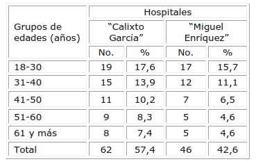 El grupo de edades más observado en ambas instituciones (tabla 2) fue el de 18 a 30 años con 19 (17,6 %) en el Hospital Universitario “General Calixto García” y 17 (15,7 %) en el Hospital “Miguel Enríquez”. Le siguió en cuantía el de 31 a 40 años (13,9 % y 11,1 %, respectivamente, en estos hospitales) y el menos observado fue el de 61 y más años (7,4 % y 4,6 % en la misma distribución). No hubo diferencias significativas en el comportamiento de los grupos de edades entre las dos instituciones.