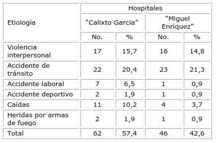 La etiología más detectada fue el accidente de tránsito, en 23 pacientes (21,3 %) en el Hospital “Miguel Enríquez” y en 22 (20,4 %) en el Hospital Universitario “General Calixto García”. La segunda etiología más detectada fue la violencia interpersonal (15,7 % en el Hospital Universitario “General Calixto García” y 14,8 % en el Hospital “Miguel Enríquez”). El accidente deportivo y las heridas por arma de fuego fueron registrados en la misma frecuencia y distribución por hospitales, con 2 pacientes (1,9 %) y 1 paciente (0,9 %) cada una en el Hospital Universitario “General Calixto García” y Hospital “Miguel Enríquez”, respectivamente. El comportamiento etiológico no mostró diferencias significativas entre las dos instituciones (tabla 3).