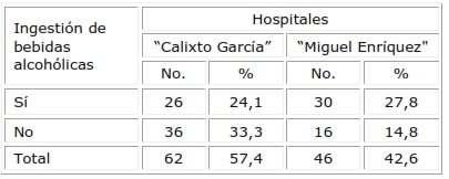 Predominaron los pacientes bajo los efectos de la ingestión de bebidas alcohólicas (tabla 4) en el Hospital “Miguel Enríquez” (30 para un 27,8 %), sobre los del Hospital Universitario “General Calixto García” (26 para un 24,1 %). El análisis de la asociación de variables mostró valores significativos, de lo que se interpreta que en los pacientes que acudieron al Hospital “Miguel Enríquez”, este tipo de traumatismo estuvo más asociado a la ingestión de bebidas alcohólicas.