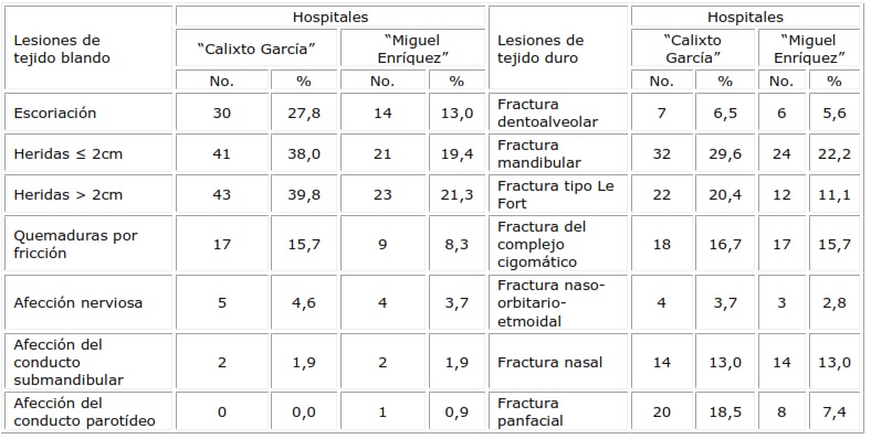 Conclusions: A predominance was found of the male sex and the 18-30 years age group; the main etiology was traffic accidents, followed by interpersonal violence; the most common soft tissue injuries were wounds larger than 2 cm, whereas the most common hard tissue injuries were mandibular fractures. A significant association was found with consumption of alcoholic beverages among the patients treated at Miguel Enríquez Hospital.