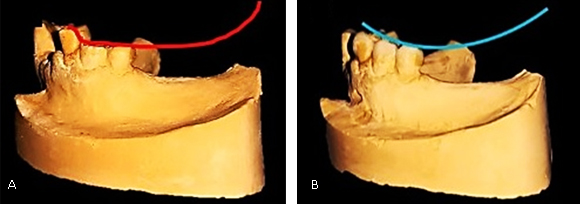 Fig. 1 - A: Curva de Spee oclusal inicial. B: Encerado diagnóstico compensando curva de Spee.