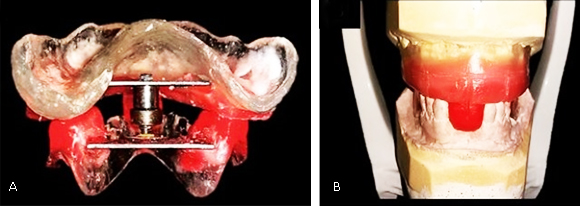 Fig. 2 - A: Registros bimaxilares, con punta inscriptora en relación céntrica. B: Montaje en articulador semiajustable.