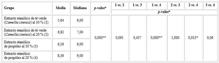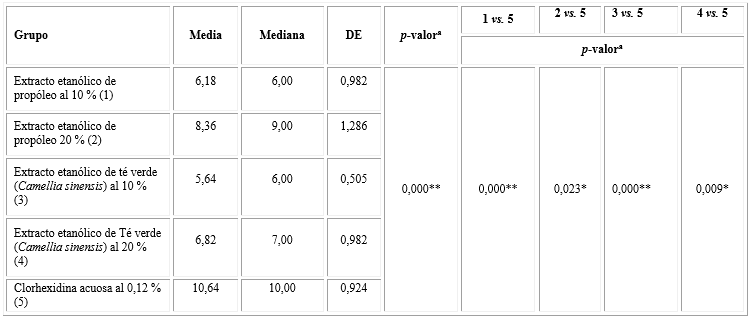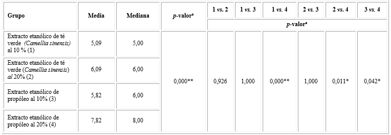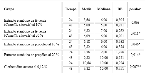 En la tabla 4 se observa, que la actividad antibacteriana a las 24 h de los extractos etanólicos al 10 % de propóleo y de té verde (Camellia sinensis), cada uno comparado con la clorhexidina acuosa al 0,12 %, presentaron diferencias estadísticas muy significativas (ambos p< 0,0001). En este mismo sentido al comparar los extractos etanólicos al 20 % de propóleo y de té verde (Camellia sinensis) con la clorhexidina acuosa al 0,12 %, las diferencias fueron estadísticamente significativas (p= 0,023 y p= 0,009, respectivamente).