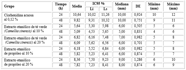 Resultados: El máximo ancho de halo inhibitorio logrado por clorhexidina acuosa al 0,12 %, extracto etanólico de té verde (Camellia sinensis) al 20 % y extracto etanólico de propóleo al 20 % fue a las 24 h con valores de 10,64 mm ± 0,924 mm, 6,82 mm ± 0,982 mm y 8,36 mm ± 1,286 mm, respectivamente. El extracto etanólico de té verde (Camellia sinensis) al 20 %, presentó diferencias estadísticamente significativas respecto al extracto etanólico de propóleo al 20 %, tanto a las 24 h (p= 0,013), como a las 48 h (p= 0,011).
