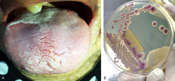 En el examen clínico estomatológico, se logró observar diversidad de tipos clínicos de candidiasis bucal, para lo cual la frecuencia estuvo encabezada por la candidiasis atrófica lingual en el 37 %, seguida de candidiasis pseudomembranosa ubicada en cara dorsal de lengua en el 33 %, entre otros tipos de candidiasis bucal (Fig. 1, A y tabla 2). La mayoría de estos pacientes manifestaron durante la anamnesis tener dificultad para acceder a los implementos de higiene bucal como: cepillo dental, enjuague bucal y seda dental. Al mismo tiempo manifestaban desconocer la presencia de la infección justificada por lo asintomático del cuadro clínico.
