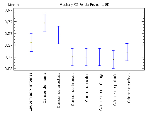 El promedio de especies de Candida es significativamente diferente entre los tipos de cáncer estudiados, ningún valor p fue mayor que 0,05, lo cual indica que los diagnósticos oncológicos presentaron un efecto estadísticamente significativo sobre la presencia de especies de Candida y viceversa, con el 95,0 % de nivel de confianza (Fig.2 y tabla 4).