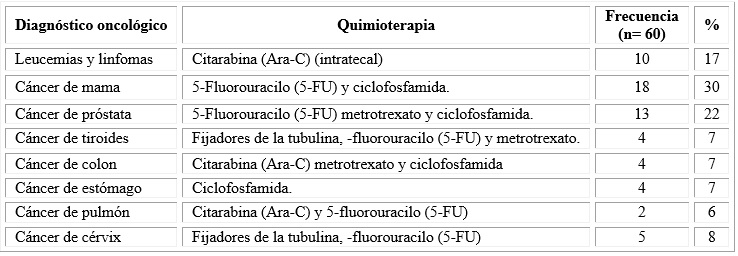 Según la frecuencia de diagnósticos oncológicos encontrados en la presente investigación, cáncer de mama en mujeres fue el que más se presentó en el 30 % (tabla 1), a los cuales las quimioterapias instauradas correspondieron a 5-fluorouracilo (5-FU) combinado con ciclofosfamida, protocolizado a criterio del oncólogo tratante. Igualmente se encontró que el cáncer de próstata sigue siendo el diagnóstico oncológico más frecuente en el sexo masculino (22 % ), para lo cual el esquema quimioterapéutico fue 5-fluorouracilo (5-FU) metrotrexato y ciclofosfamida. Otros tumores y diversas terapias se evidenciaron en los pacientes objeto de estudio.