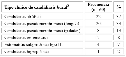 Otros tipos de candidiasis bucal que se hicieron manifiesto fueron: la candidiasis eritematosa, hiperplásica y candidiasis asociada a estomatitis subprotesica (ESP) tipo II, los pacientes de este último grupo correspondieron al 7,0 % del grupo estudio y refirieron dormir con la prótesis dental del maxilar superior y poca higiene bucal. Cabe resaltar que en el transcurso de la atención estomatológica, los pacientes fueron tratados farmacológicamente con esquemas que variaban según el tipo de candidiasis: aplicación tópica de miconazol (Daktarin® Gel Oral laboratorio JANSSEN-CILAG S.A Bogotá- Col) 1 cc por 5 min, 4 veces al día (después de cada comida y antes de dormir) durante 15 días; previo a la higiene bucal con cepillado convencional y secado de la mucosa con una gasa, y de forma sistémica con nistatina en suspensión, dependiendo de sus kilogramos de peso se aplicó la posología por vía oral y tópica. Estos pacientes diagnosticados con candidiasis bucal, fueron controlados en el transcurso de la evolución del cuadro clínico candidiásica, e inclusive se realizaron cambios de prótesis y alivio de zonas traumáticas en los que no ameritaba el cambio de esta.