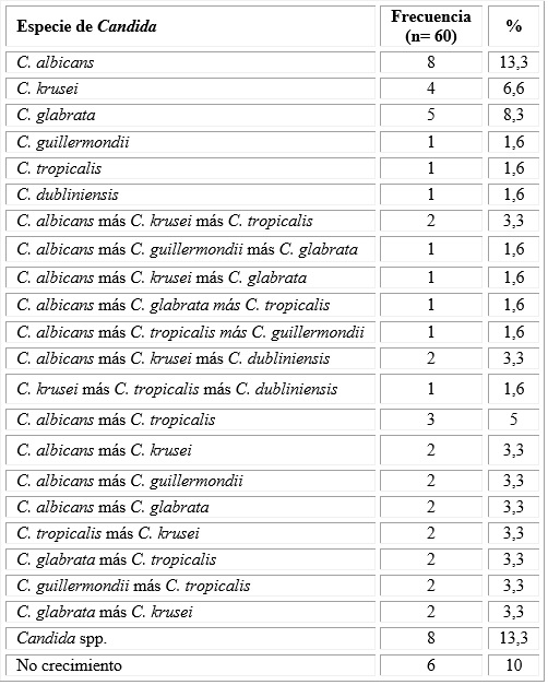 Methods: A descriptive cross-sectional study was conducted of 60 samples of an equal number of patients selected by convenience sampling at an Oncological Institute in Barranquilla, Colombia, following diagnostic clinical examination for oral candidiasis. Swab samples were taken from the infected surfaces to perform direct examination – Gram staining and Sabouraud dextrose agar culture with chloramphenicol incubated at 37ºC for 48 h and then cultured in CHROMagar®Candida medium – for identification of various species. Analysis was based on correlation and descriptive statistics.