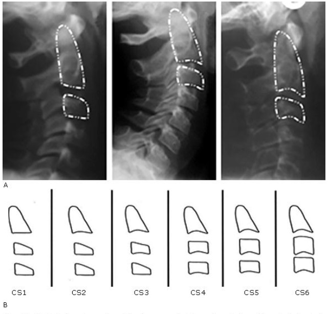 A) Estadíos de maduración ósea cervical tomadas de la radiografía lateral de cráneo. B) Esquema representativo donde se identifican los estadios de maduración ósea vertebral cervical bajo los estándares del método descrito por Baccetti y otros.16