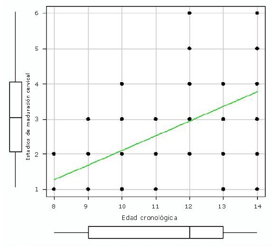 Diagrama de dispersión entre la edad cronológica y los estadios de maduración cervical de los niños estudiados.