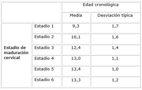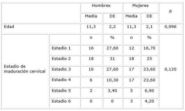 Al analizar los estadios de maduración cervical en función del sexo se identificó que 27,6 % de los varones y 16,7 % de las hembras presentaban un estadio de maduración 1. También se evidenció que 10,3 % de los varones y 23,6 % de las hembras están en el estadio 4. Debe destacarse que ningún varón, y 4,2 % de las hembras presentaron el estadio 6 (tabla 1).