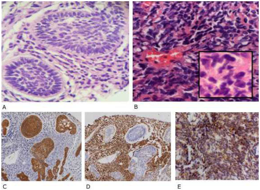 A) Microscopic evaluation, representing the epithelial area with nests and thin plexiform anastomosing cords and strands of odontogenic epithelium. B) Microscopic evaluation, representing the mesenchymal area with spindle and stellate cells that exhibited moderate nuclear pleomorphism and vesicular to densely hyperchromatic chromatin. C) AE1-AE3 cytokeratin labelling the epithelial component of the tumor. D) Vimentin labelling the mesenchymal component of the tumor. E) Intense p53 labeling in all tumoral cells.