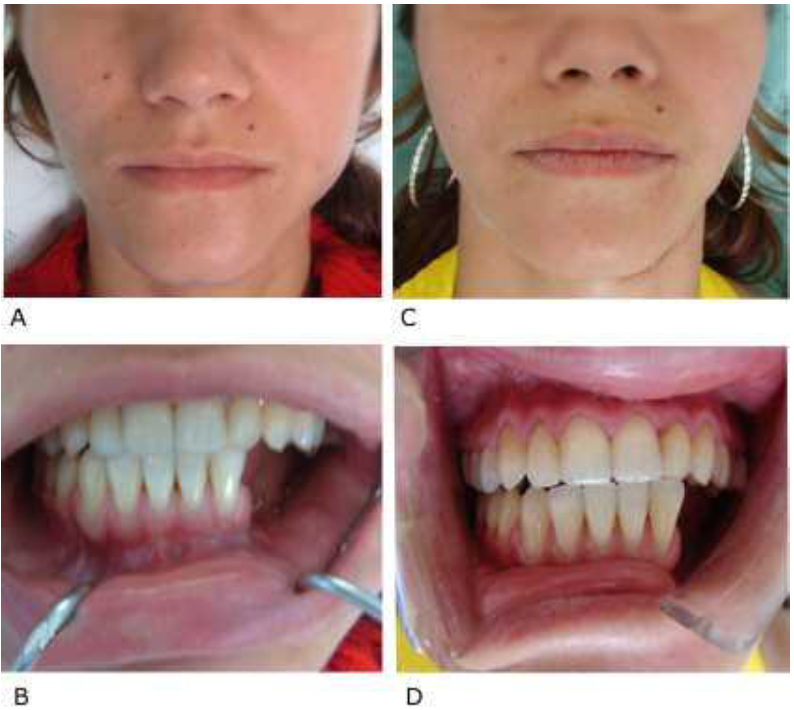 Imges form patient’s recovering. A) and B) images from a month of follow up; C) and D), from eight months of follow up. Note the facial symmetry and midline correspondence between jaws.