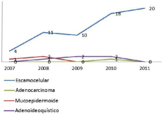 El diagnóstico más común fue el de carcinoma escamocelular (86,3 %), IC 95 %: 78,2-94,3. En el año 2010 los pacientes diagnósticos fueron 18 (30,1 %); en 2011 27,4 %, mientras que en el año 2007 solo se diagnosticaron 5 casos (6,8 %) (Fig. 2).